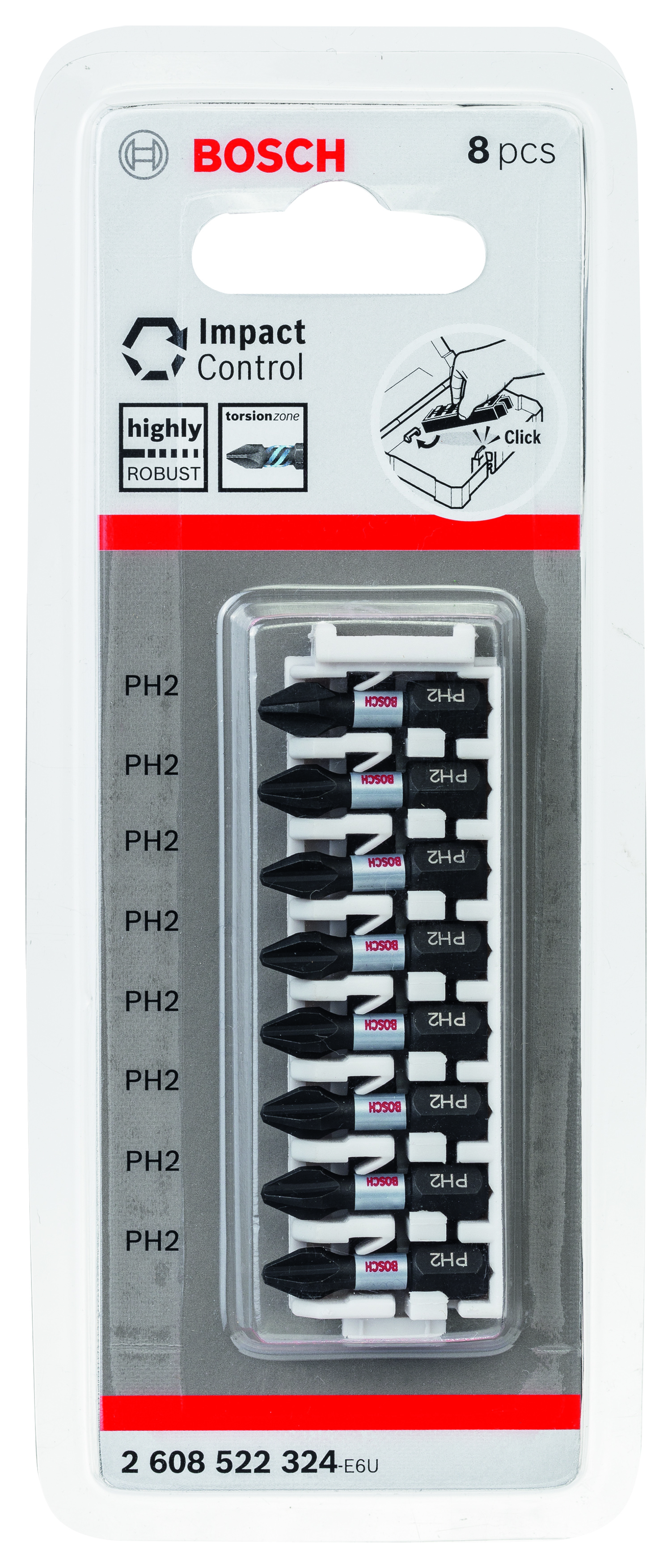 Impact control skrutrekkerbits er svært robuste, velegnet for krevende oppgaver og tåler til og med kraften fra slagdriller. Bitsene har utvidet torsjonssone, noe som gir dem høy slitestyrke ved tidkrevende oppgaver. S2 modifisert stål og en optimalisert varmbehandlingsprosess gir dessuten ekstra styrke og sikrer høy ytelse. Bitsene har et 1/4-tommes utvendig sekskantskaft til bruk med driller, skrutrekkere og slagdriller. De er en del av Pick and Click-systemet fra Bosch, som gjør det mulig å bygge tilbehørssett enkeltvis: Alle enkeltpakker du kjøper, klikkes på plass i egne spor, slik at du kan bygge en tilpasset samling og enkelt skifte ut gamle pakker.