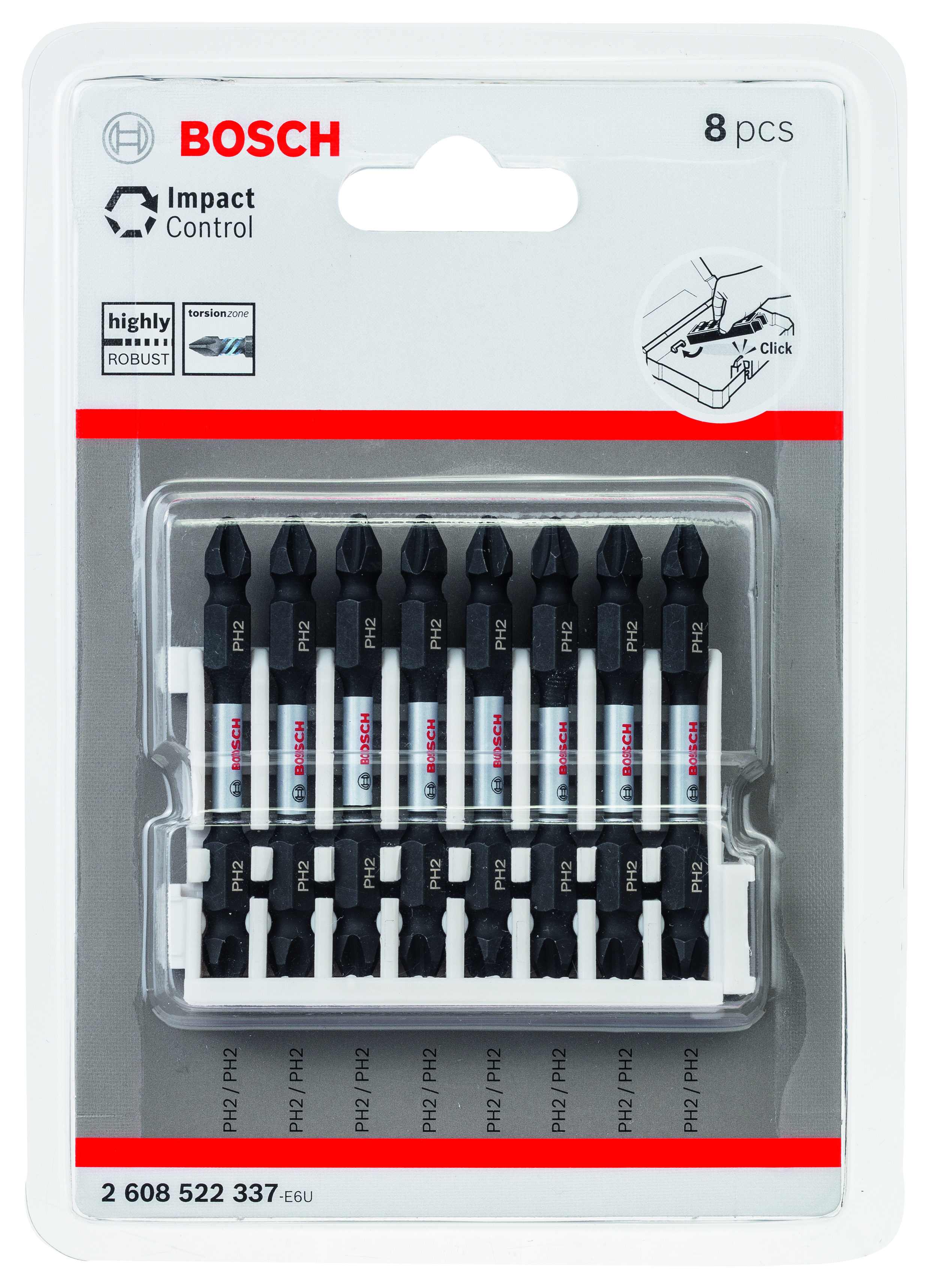 Sett som kan tilpasses, med robuste bits - Dobbeltbitsene er svært robuste, velegnet for krevende oppgaver og tåler til og med kraften fra slagdriller. Bitsene har utvidet torsjonssone, noe som gir dem høy slitestyrke ved tidkrevende oppgaver. S2 modifisert stål og en optimalisert varmbehandlingsprosess gir dessuten ekstra styrke og sikrer høy ytelse. Bitsene har et 1/4-tommes utvendig sekskantskaft til bruk med driller, skrutrekkere og slagdriller. De er del av Pick and Click-systemet fra Bosch, som gjør det mulig å bygge tilbehørssett enkeltvis: Alle enkeltpakker du kjøper, klikkes på plass i egne spor, slik at du kan bygge en tilpasset samling og enkelt skifte ut gamle pakker.