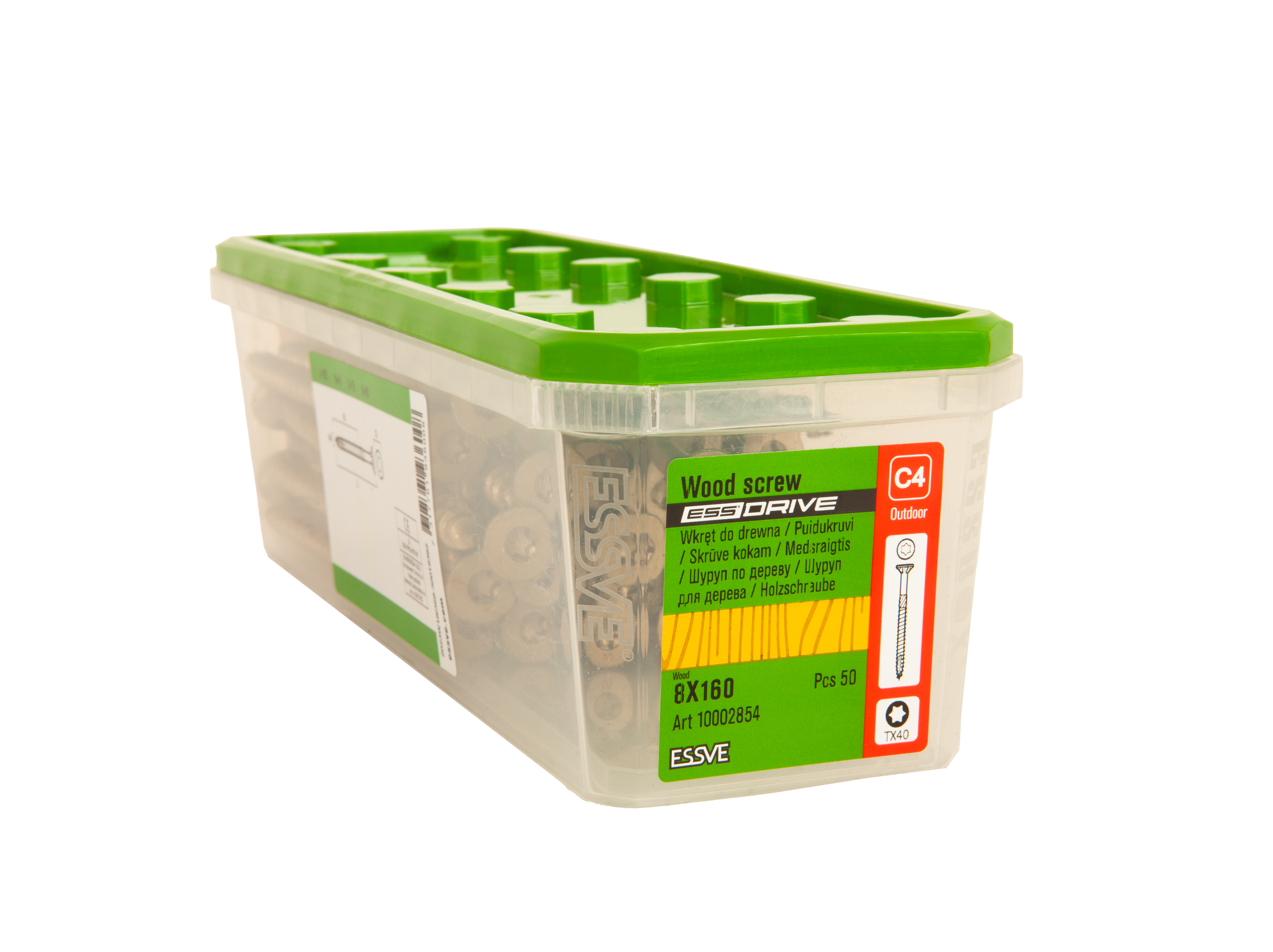 Treskrue ESSDRIVE er beregnet for montering og sammenføyning av trevirke utendørs. Skruens patenterte spiss sørger for at skruen griper umiddelbart. Hodeformen gir en perfekt finish uten sprekker eller fliser. Fresespor på stammen gir et lavt innskruingsmoment og bidrar til økt klemkraft. Skruer som er 70 mm eller lenger har et ekstra fresespor etter hovedgjengen, som bidrar til mindre motstand og lettere montering. ESSDRIVE er spesielt god i vanskelige eller unaturlige posisjoner hvor skuldre og ledd får uønsket belastning. Produsert i sterkt og fleksibelt stål, med Corrseal overflatebehandling, korrosjonsklasse C4. Anbefalt turtall: 400-1200/min